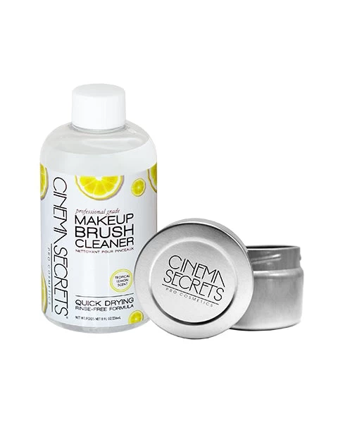 Features and Benefits Start cleaning your tools like a PRO with Cinema Secrets Makeup Brush Cleaner and Cleansing Tin. Stubborn waterproof and long wear makeup melts away and brushes dry almost instantly, no water or rinsing required leaving a pleasant lemon scent. The aluminum tin is perfect for the “Dipping Method” for deep cleaning and the twist-top lid fits tight to avoid spills on the job. As soon as brushes are dry to the touch they are ready to use.