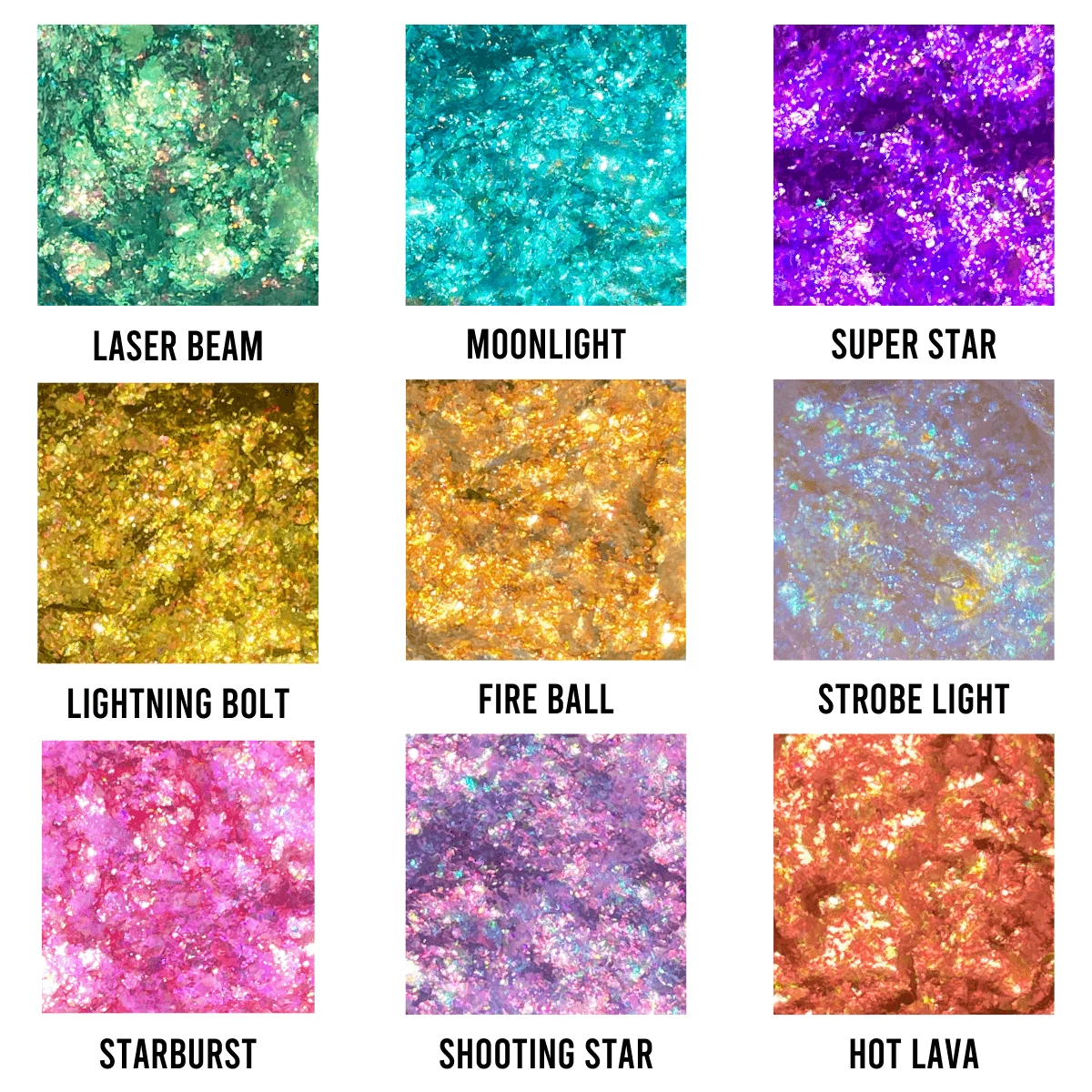 Light up any beauty look with these lightweight, easy application multi-chrome flake toppers. Instantly dramatize any eye looks with just a tap or a swipe.