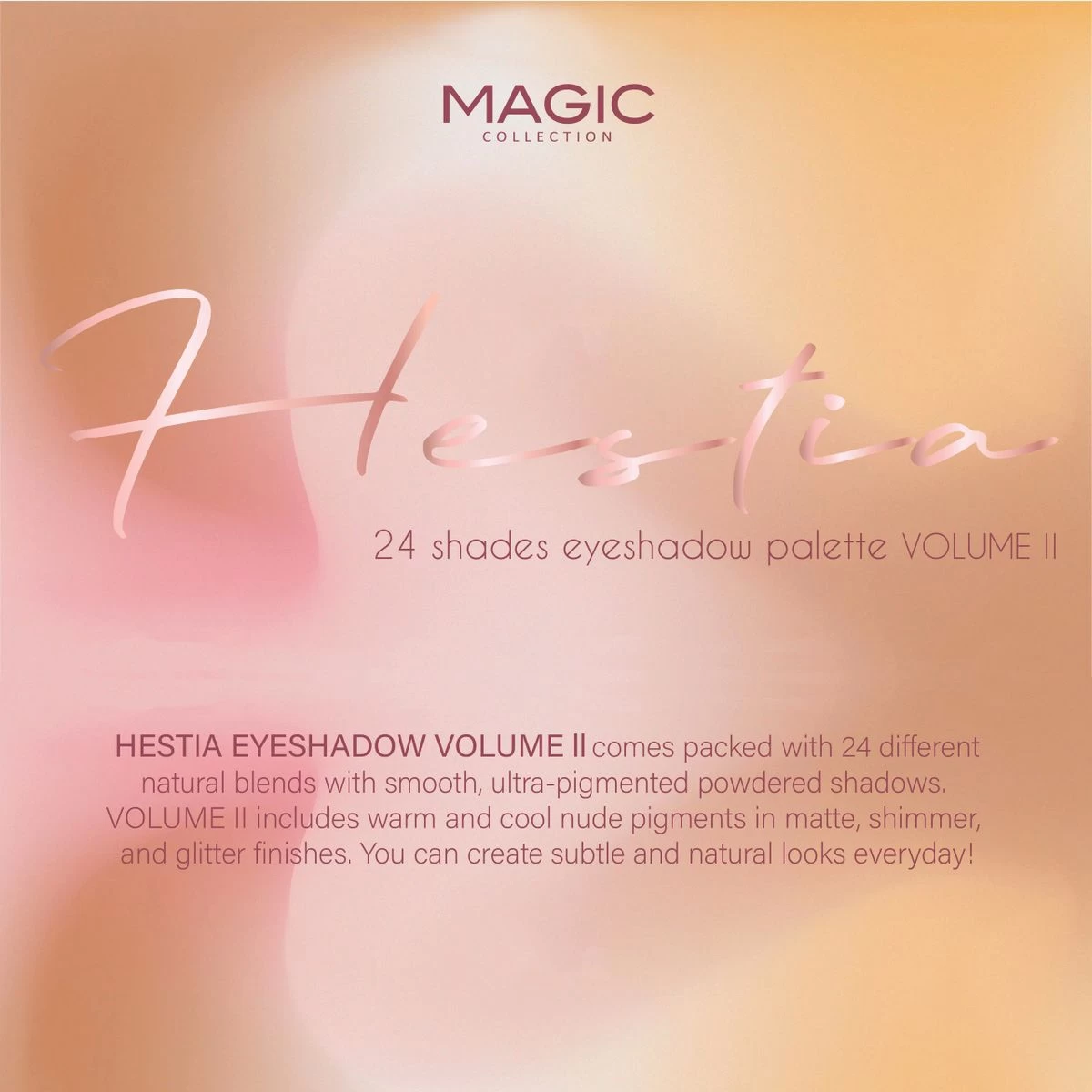HESTIA EYESHADOW VOLUME ll comes packed with 24 different natural blends with smooth, ultra-pigmented powdered shadows.Â