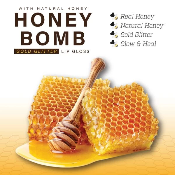 Honey Bomb Lip Gloss is made with REAL HONEY. Real honey and gold glitter are used to transform lips from dry and damaged to healthy and glowing.