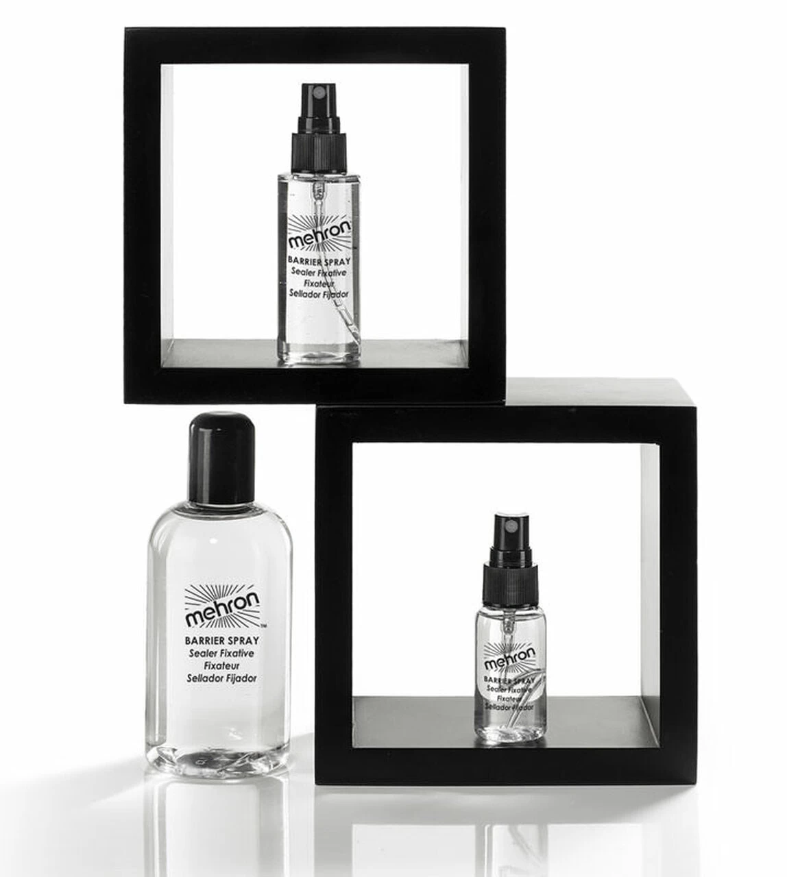 Mehron’s Barrier Spray™ is a clear liquid spray that sets makeup designs and helps protect sensitive skin from makeup, latex and other adhesives. Great for extending the wear of makeup applications for Modeling, TV, Stage, Clowning, Face Painting, Halloween, Special Effects and Photography!