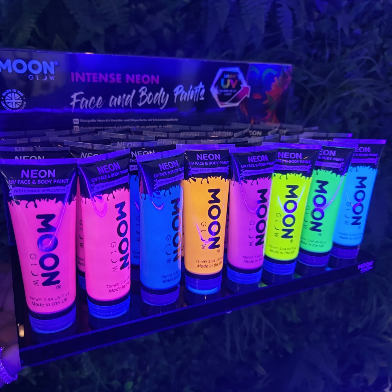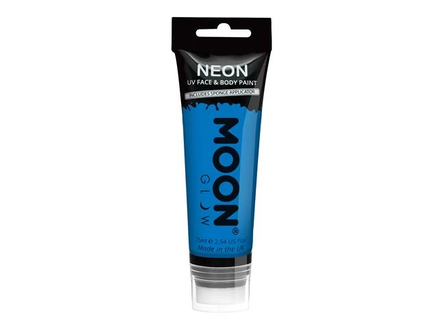 Create stunning effects on the face and body using our range of 8 vibrant colours! This Supersize Neon UV Face & Body Paint in a 75ml format is perfect for larger areas, or for makeup artists or events. Bright neon coloured paints in daylight that come alive under UV lighting / Blacklights, producing a spectacular UV Glow. Each of these tubes come with a convenient sponge applicator for quick and easy painting. Ready to use, water based face paints; our flake free and smudge resistant formula ensures your designs will last all night. After use, simply remove with soap and water.
