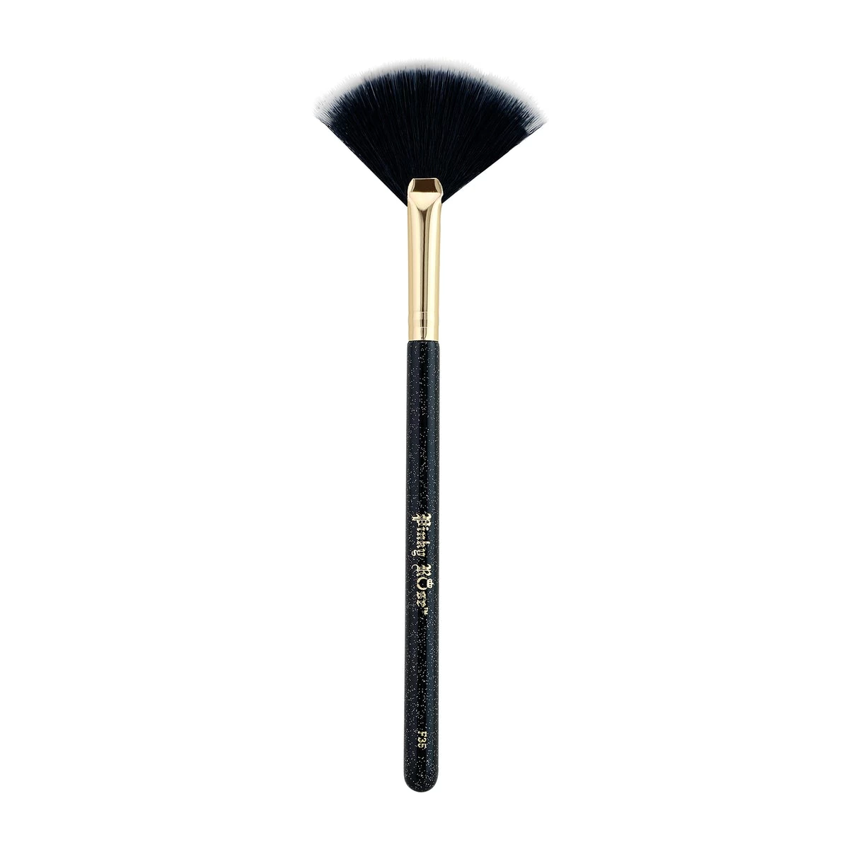 Black and white tip, synthetic brush, glossy gold aluminum ferrule with glitter specks that are unique in each brush.